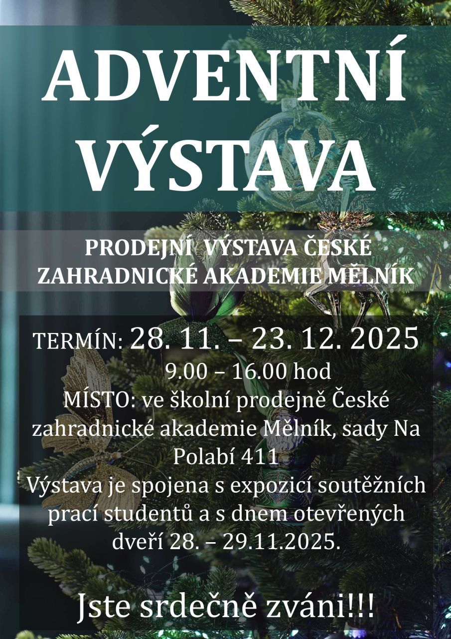 Česká zahradnická akademie Mělník zve na tradiční adventní prodejní výstavu, která proběhne od 28. listopadu do 23. prosince 2025 ve školní prodejně v sadech Na Polabí 411. Součástí je také expozice soutěžních prací studentů a den otevřených dveří 28.–29. listopadu.