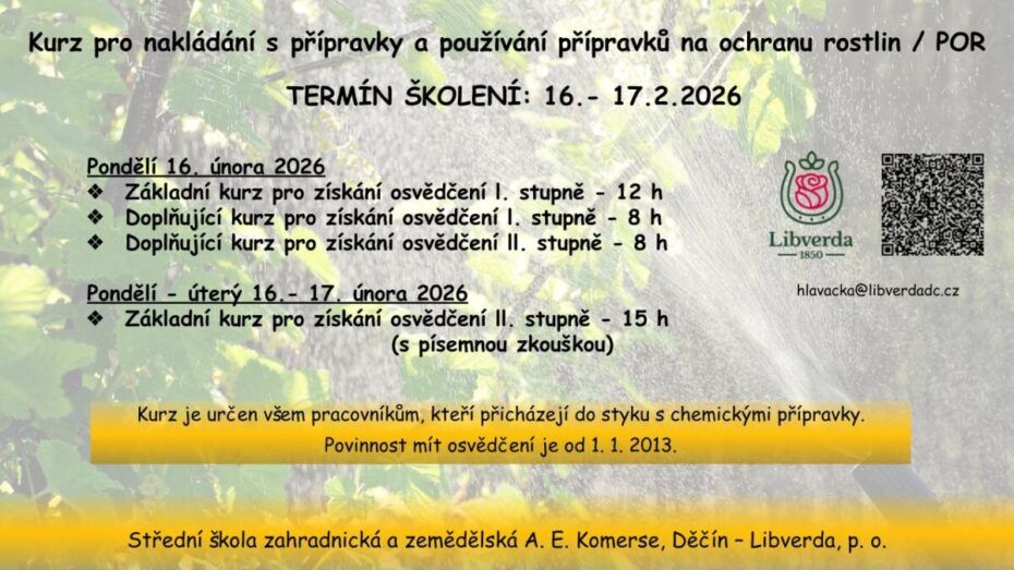 Kurz Odborná způsobilost pro nakládání s přípravky na ochranu rostlin pořádá Střední škola zahradnická a zemědělská Antonína Emanuela Komerse a je určen pro zájemce, kteří potřebují splnit zákonné požadavky v oblasti používání přípravků na ochranu rostlin. 16.-17. února 2026