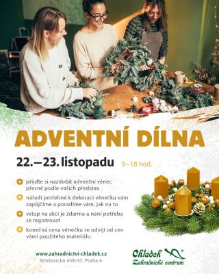 Adventní dílna v Zahradnictví ChládekPřijďte 22.–23. listopadu do Zahradnictví Chládek a vytvořte si vlastní adventní věnec či svícen podle svých představ. Materiál, poradenství i nářadí bude na místě k dispozici - stačí přijít s chutí tvořit!Dagmar KrupičkováInzerceinzerceAkcenové