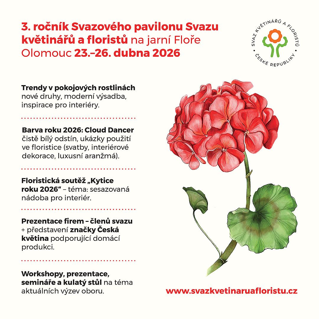 Součástí prezentace bude také barva roku 2026 Cloud Dancer, která se promítne do floristické tvorby a aranžmá a ukáže aktuální směřování oboru.