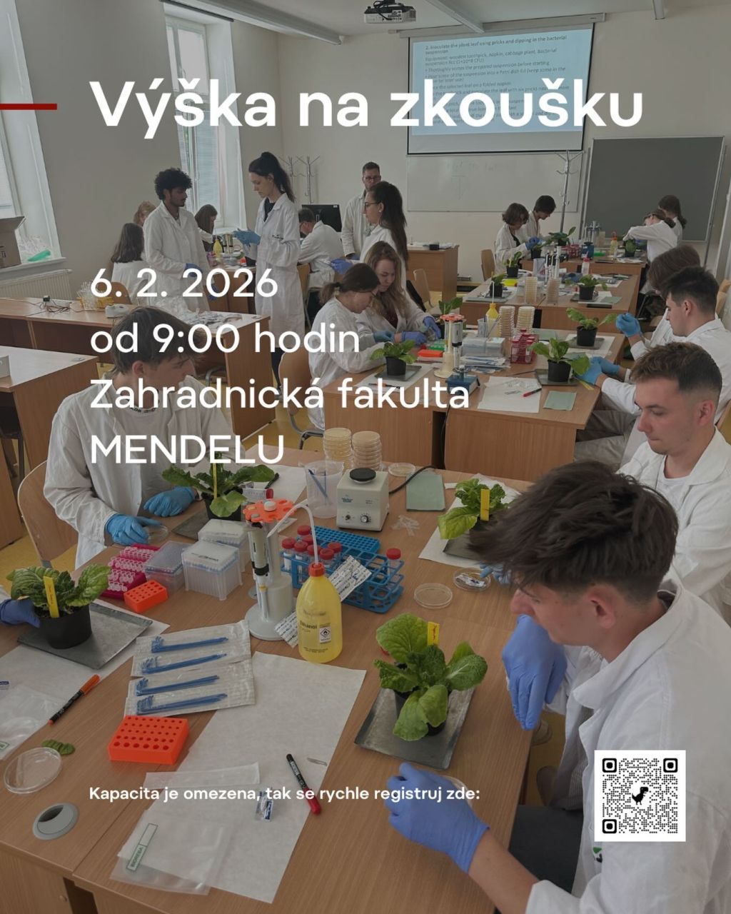 Akce Výška na zkoušku se uskuteční 6. února 2026 v Lednici na Zahradnická fakulta MENDELU. Program je určen především studentům 3. a 4. ročníků středních škol, kteří mají zájem poznat studium na vysoké škole zblízka.